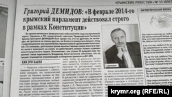 «Крымские известия» опубликовали интервью с заслуженным юристом Украины, внештатным советником подконтрольного Москве спикера крымского парламента Григорием Демидовым. Он рассказал о событиях февраля 2014 года, которые происходили в Крыму. По словам Демидова, 26 февраля у входа в крымский парламент «собралась радикально настроенная толпа, препятствовавшая прохождению депутатов на заседание».