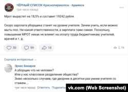 А в сообществе «Черный список Красноперекопск – Армянск» тема обсуждения вообще отклонилась от «партийной линии». «МРОТ вырастет на 18,5% и составит 19242 рубля. Скоро зарплата уборщика станет на уровне учителя. Зачем учить, если можно мыть пол. Никакой ответственности, а зарплата та же самая. Поскольку, повышение МРОТ никак не влияет на оплату труда бюджетникам, учителей, врачей и т.д.» – вынес вопрос на обсуждение администратор паблика.