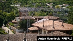 «Уже смонтированная конструкция, там будет купол, который позволит разобрать крышу, для того чтобы снять нагрузку и проводить в дальнейшем уже именно реставрационные работы», – рассказывает для СМИ руководитель подконтрольной Кремлю администрации Бахчисарая Александр Трянов.