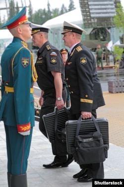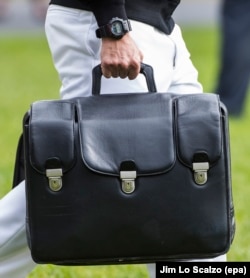 Сообщается, что российские военнослужащие с чемоданами всегда носят форму морских офицеров, чтобы их было легко заметить в многолюдной свите президента России.