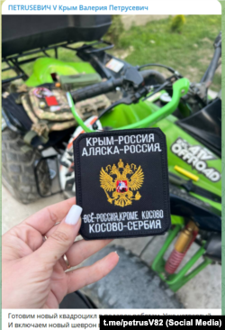 Крымчанка Петрусевич также собирает коллекцию патчей, в ее коллекции есть шеврон «Все – Россия, кроме Косово, Косово – Сербия».