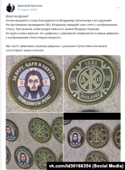 Священники периодически участвуют и в освящении шевронов. Это шевроны, которые раздает военным РФ сам Кротков.