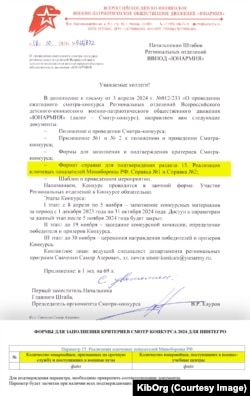 Согласно данным по утечке, в октябре 2024 года первый замначальника главного штаба «Юнармии» Виктор Кауров разослал письма региональным центрам о проведении обязательного ежегодного «смотр-конкурса». В них говорится, что штабы-победители определят после оценки предоставленных документов. В частности, справки для подтверждения 15-го пункта (реализация ключевых показателей Минобороны РФ).