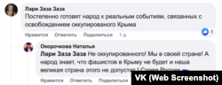 «Не оккупированного! Мы в своей стране! А народ знает, что фашистов в Крыму не будет и наша великая страна этого не допустит! Слава России», – транслирует в ответ нарративы российской пропаганды Окорочкова Наталья.