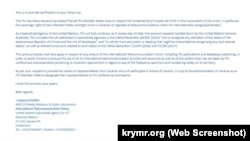 Международный союз электросвязи (МСЭ) распределяет частотный ресурс в государствах и между ними, он также регулирует действие Европейской конвенции о трансграничном телевидении. В официальном комментарии Крым.Реалии МСЭ заявили, что, в соответствии с резолюцией Генеральной Ассамблеи ООН, не признают аннексию Крыма и осуждают это международное преступление. Но юристы в области медиа единогласно утверждают, что МСЭ не имеет никаких рычагов влияния на государство-нарушитель и остается пассивным наблюдателем развития событий.