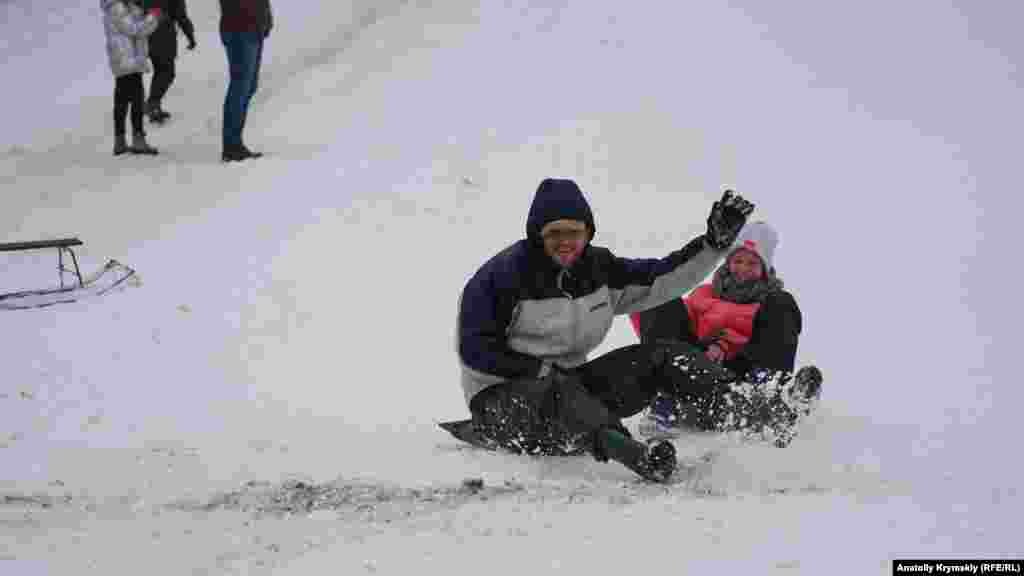 Дети и взрослые предпочитают кататься на учебном горнолыжном спуске на санях