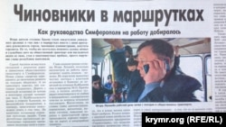 «Крымская правда» в статье «Чиновники в маршрутках» пишет о том, как нынешний руководитель Симферополя, чиновники администрации города и депутаты горсовета проехались в общественном транспорте. Это было сделано после поручения главы Крыма Сергея Аксенова, возмутившегося ситуацией с ремонтом дорог и движением общественного транспорта в Симферополе.