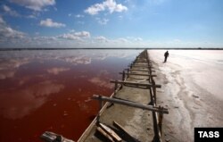 В советские времена тут работал целый промышленный комплекс. Сольпром был подразделением сакского химзавода, добыча шла в десяти бассейнах. В конце восьмидесятых ее сократили, теперь тут работает частное предприятие «Галит». В огороженные участки зимой заливают морскую воду – летом жидкость испаряется, а соль остается. Розовый цвет – это бета-каротин, которым соль насыщается от водорослей под названием Dunaliella Sallina.